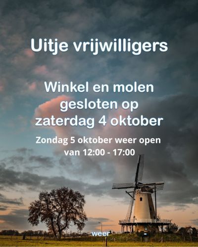 De Windhond (zowel de molen als de winkel) is gesloten op zaterdag 4 oktober. Op die dag hebben de vrijwilligers van de molen een gezamenlijk uitje. We hopen je te begroeten op een andere dag.