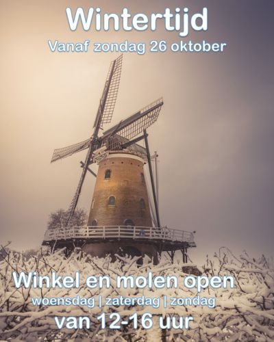 Vanaf zondag 26 oktober gaat de wintertijd weer in. De molen heeft in de winter aangepaste openingstijden. De molen en molenwinkel zijn dan open van 12:00 tot 16:00 uur. Ook in de winter ben je van harte welkom op De Windhond!